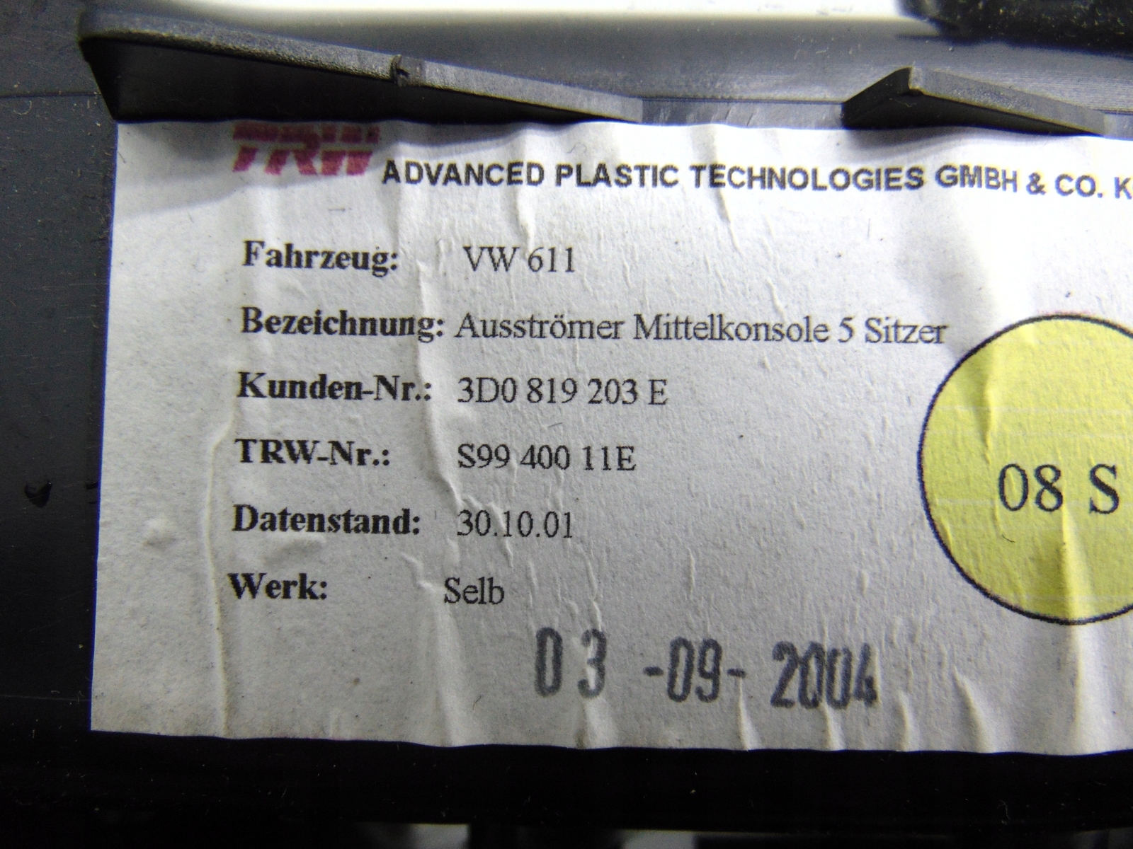 воздухозаборник жалюзи потока воздуха зад панель vw PHAETON 3D0819203E