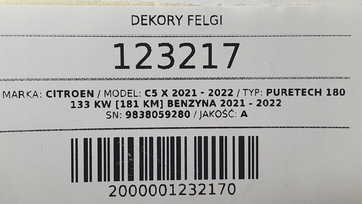 ZAPZA — уникальный маркетплейс запчастей автотоваров и услуг для физ и юр лиц. В каталоге маркетплейса ZAPZA представлены новые, б/у и восстановленные автозапчасти, для всех типов транспорта. Автодеталь Значки Колпаки Колесные диски комплект CITROEN C5 X 9838059280 после демонтажа прошла проверку и готова к дальнейшей эксплуатации.
