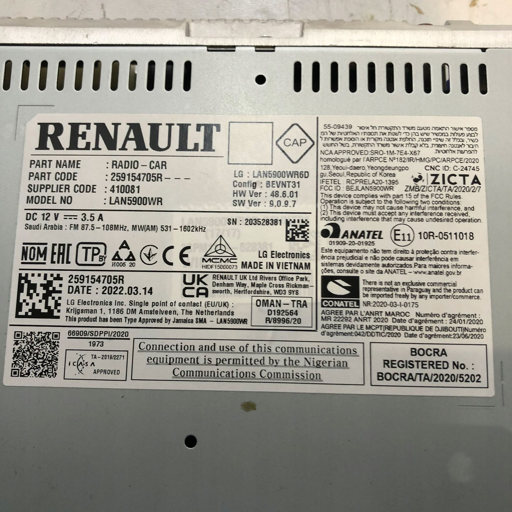 ZAPZA — уникальный маркетплейс запчастей автотоваров и услуг для физ и юр лиц. В каталоге маркетплейса ZAPZA представлены новые, б/у и восстановленные автозапчасти, для всех типов транспорта. Автодеталь Dacia DUSTER II радио 259154705R LAN5900WR после демонтажа прошла проверку и готова к дальнейшей эксплуатации.
