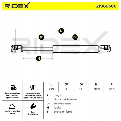 пружина газовая, крышка багажника ridex 219G0300