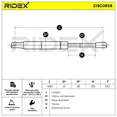 пружина газовая, крышка багажника ridex 219G0858